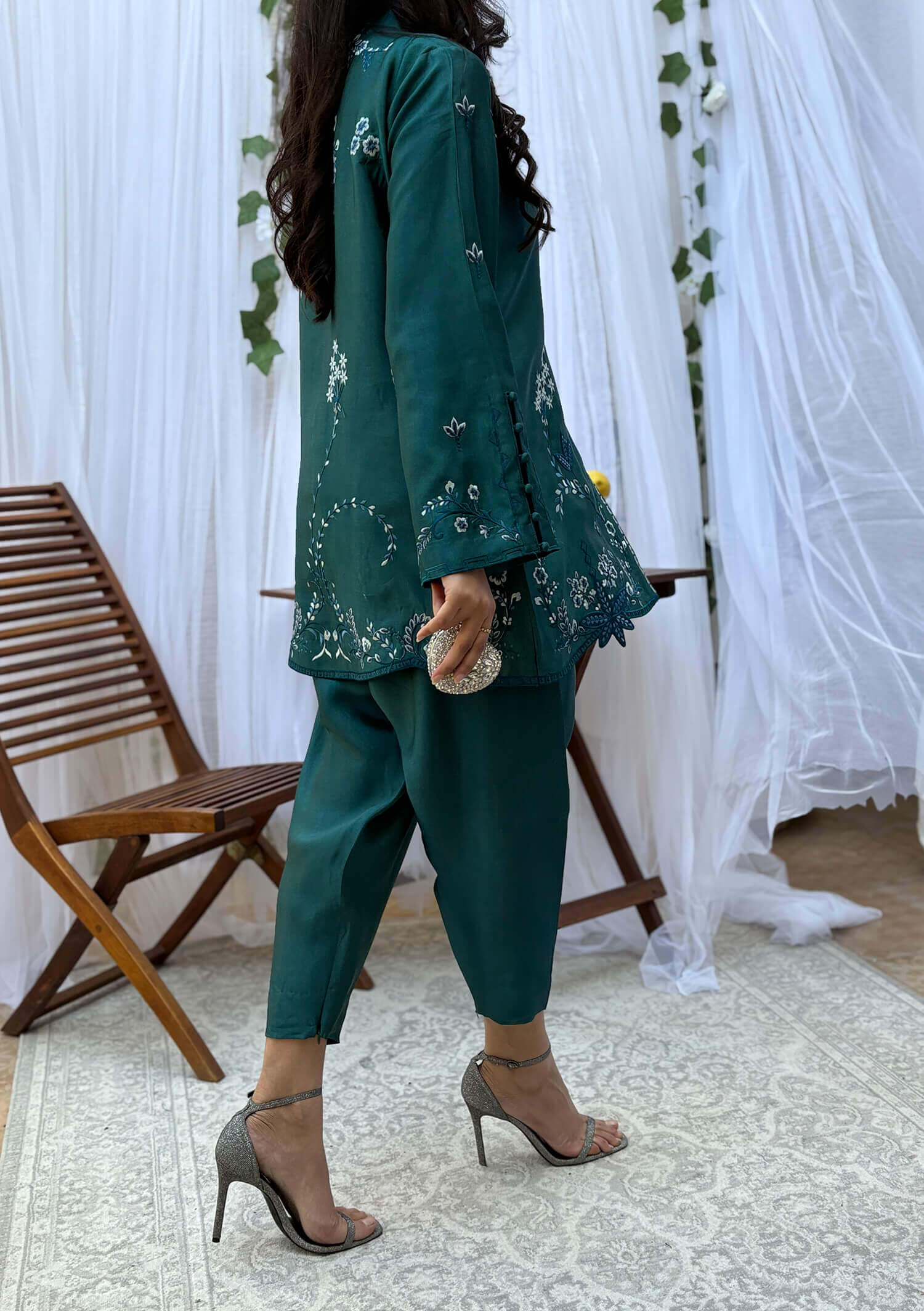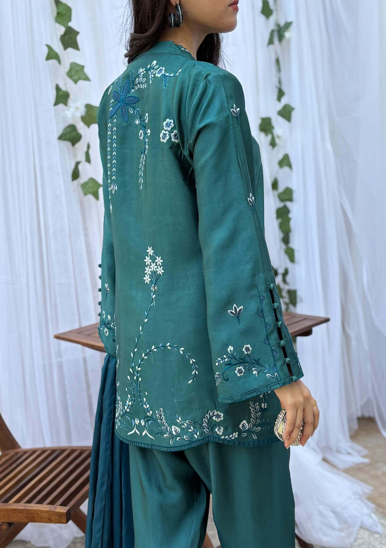 Rendered in pure sheesha silk, this short statement jacket features delicate resham embroideries in teal and soft blues, elevated with deep blue appliqué work. Styled with a straight shalwar and a contrasting blue medium silk dupatta. Effortless, modern, and timeless.