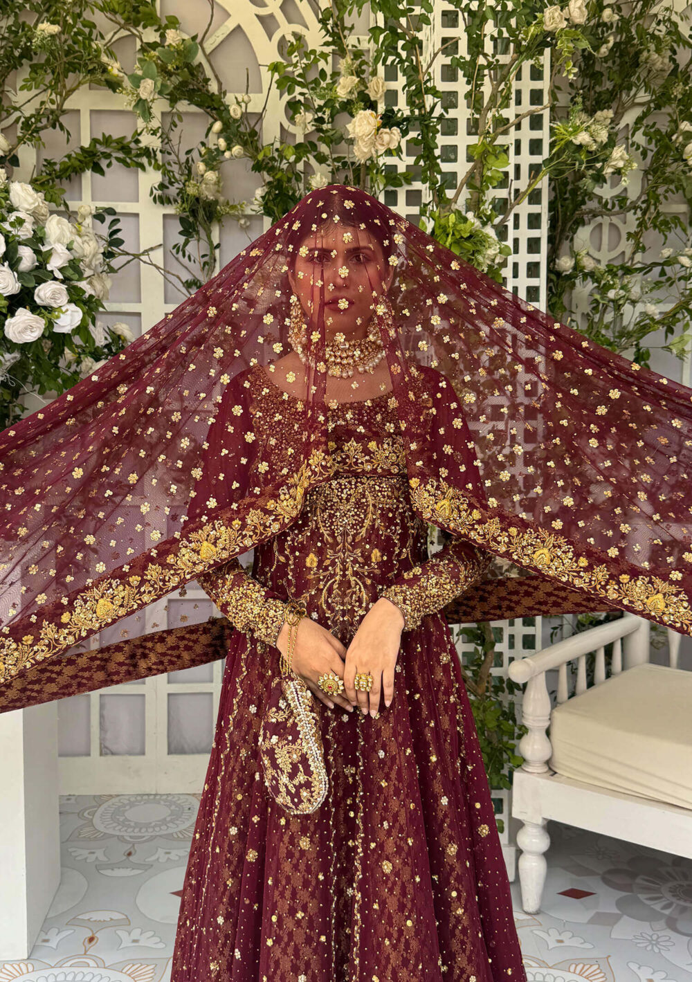 For the bride who dares to be different, Ashal brings. a contemporary twist to bridal couture. Crafted on french net in an elegant silhouette, it features a richly handworked hemline border, a detailed neckline and a captivating mix of spray work and kaamdani through the panels. Paired with a flowing lehenga finished with a luxurious tissue border, this ensemble moves with grace. The look completed with a net dupatta edged in a lavish handworked border and adorned with delicate spray work, creating a bridal statement that blends modern charm with timeless craftsmanship.