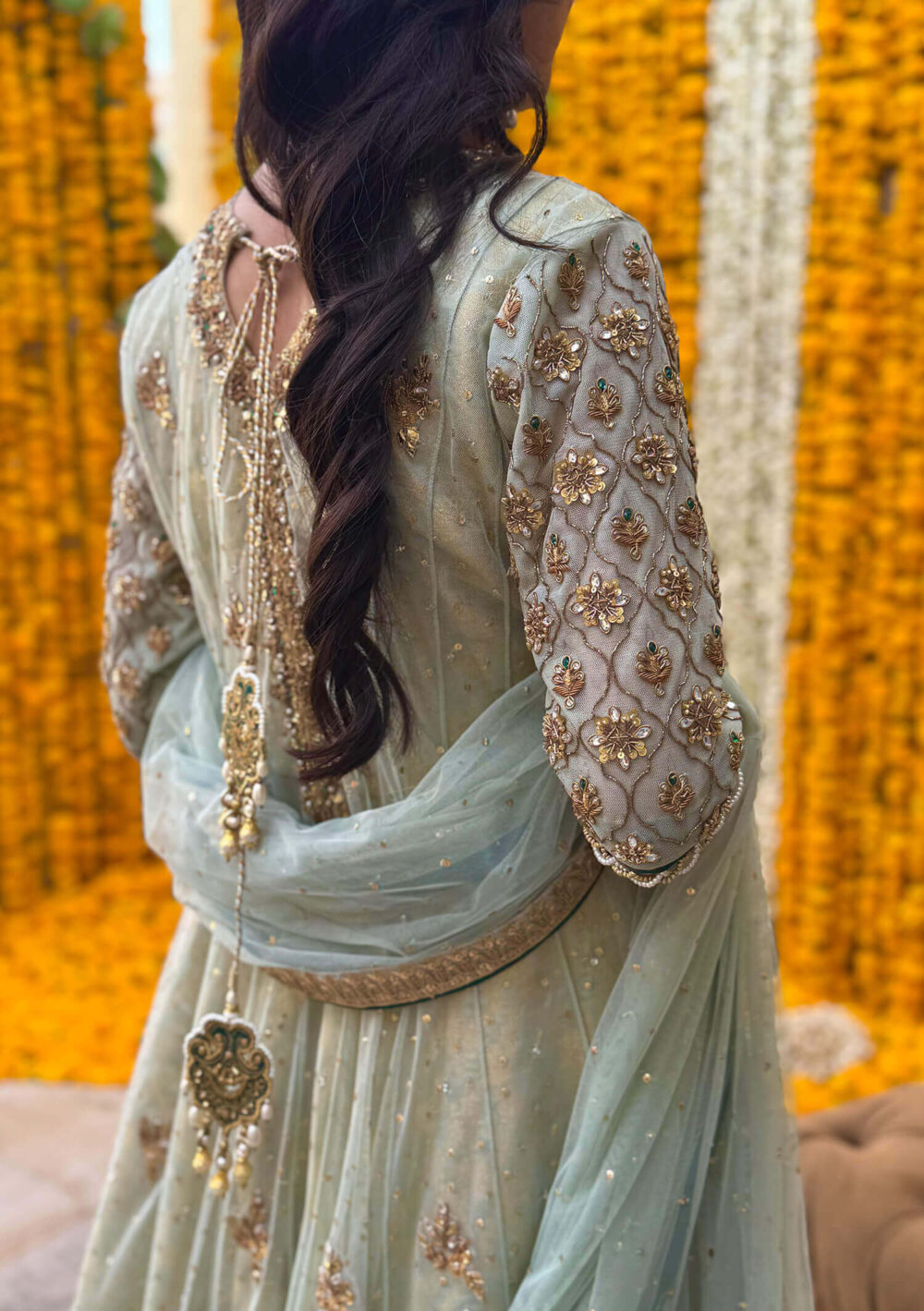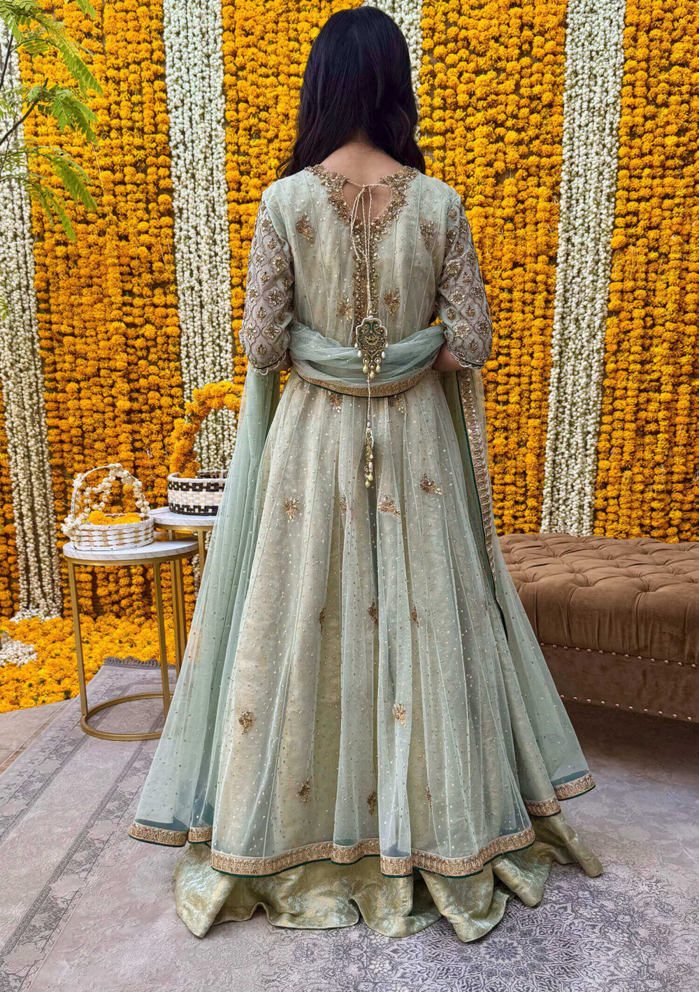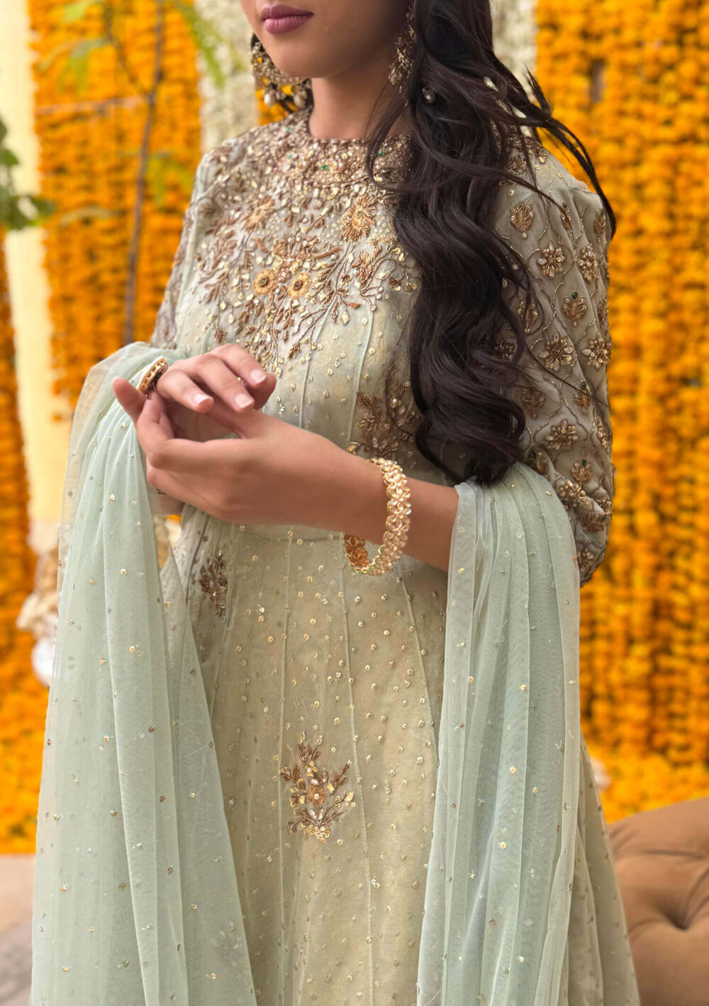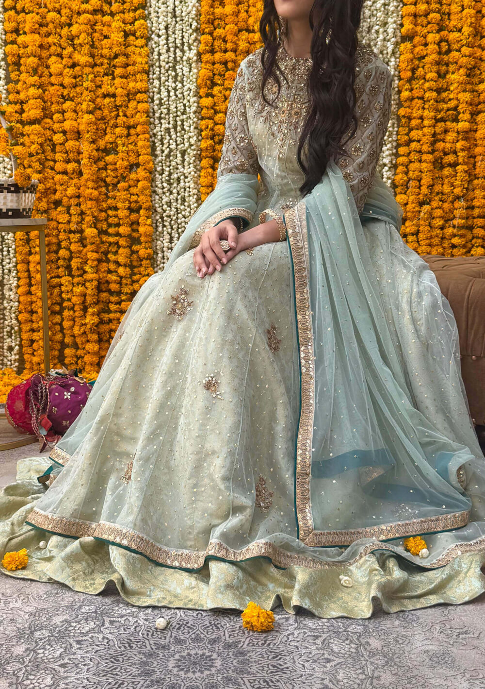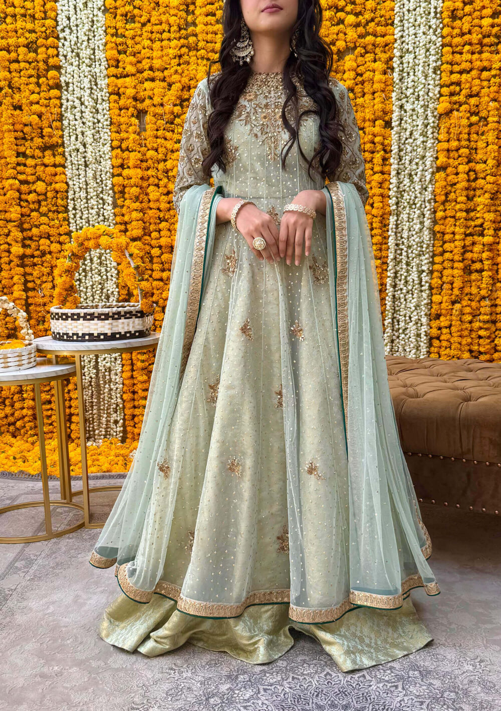 A true ode to tradition, Rhea features a classic kalidaar silhouette in soft pistachio green net, adorned with exquisite kundan, dapka and kora handwork. the look is elevated by a richly embellished dupatta and a regal jamavar lehenga that adds depth and texture. Contrasting emerald green finishings bring a bold, distinctive edge — Rhea is timeless elegance with a signature twist.