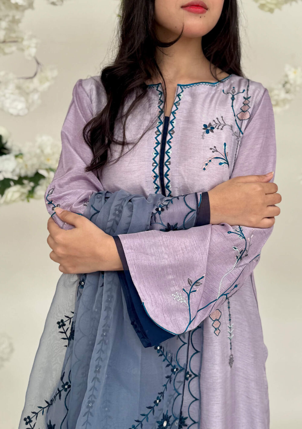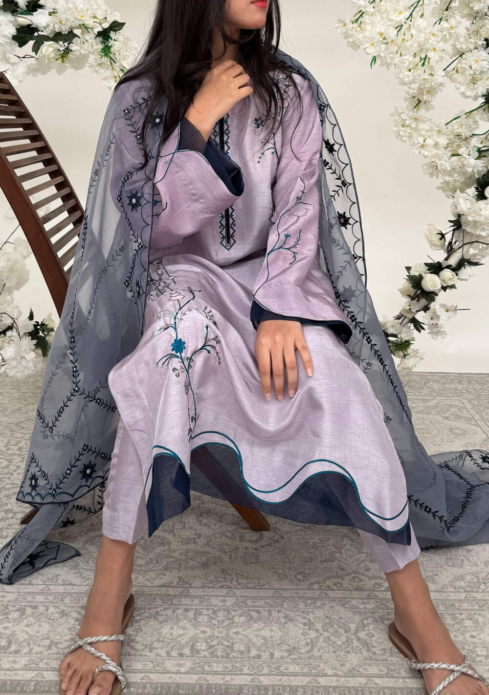 A refreshing blend of lavender and wisteria grey-blue dupatta, makes Auri a standout choice. The shirt features delicate embroidery on the front and sleeves in soft seagreen, greys and blues paired with straight pants for effortless elegance. The flowing silhouette is complimented by a heavily embroidered organza dupatta, offering a graceful yet easy to wear look. Perfect for summer gatherings with a touch of charm.