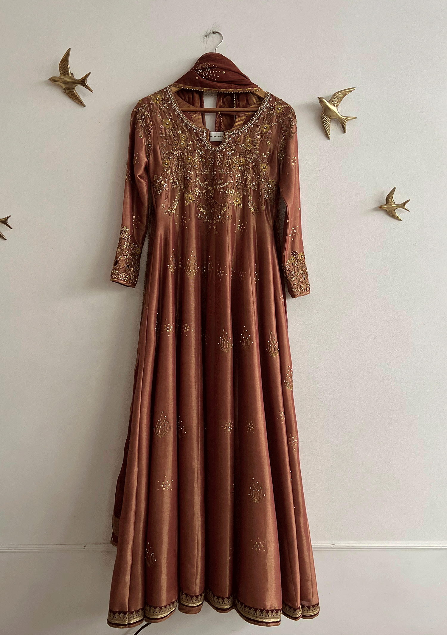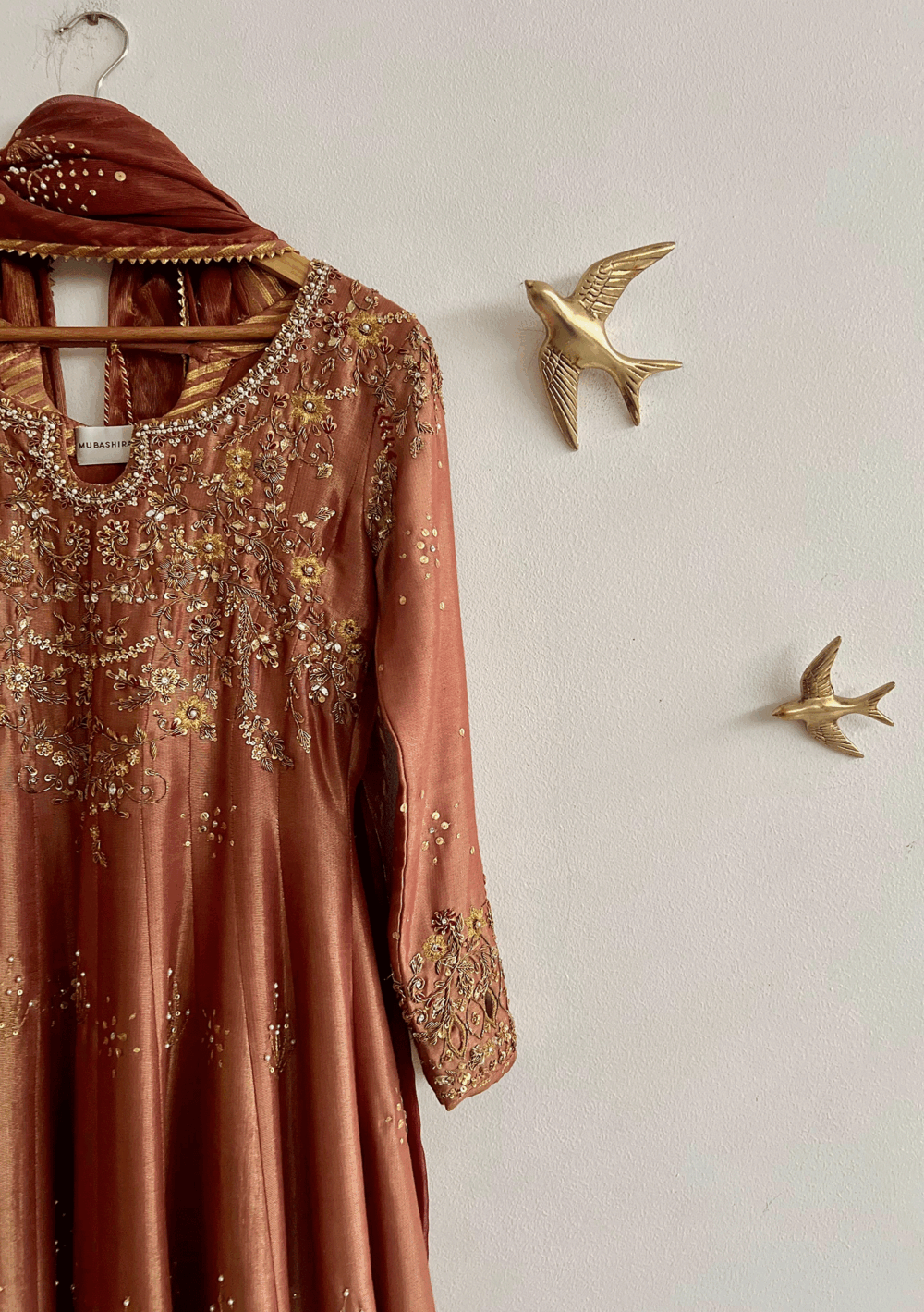 Maisha brings a refrenshing take on tradition with its stunning aqua Maysuri Kalidaar, beautifully contrasted by a deep green net dupatta with beautiful handwork chan and motifs. handworked with tilla and dapka, the outfit features detailed borders that add richness to the hemline. back tassels lend a signature finish, while the full gown silhouette offers a festive, regal flair. Maisha is made for celebrations that call for effortless grace.