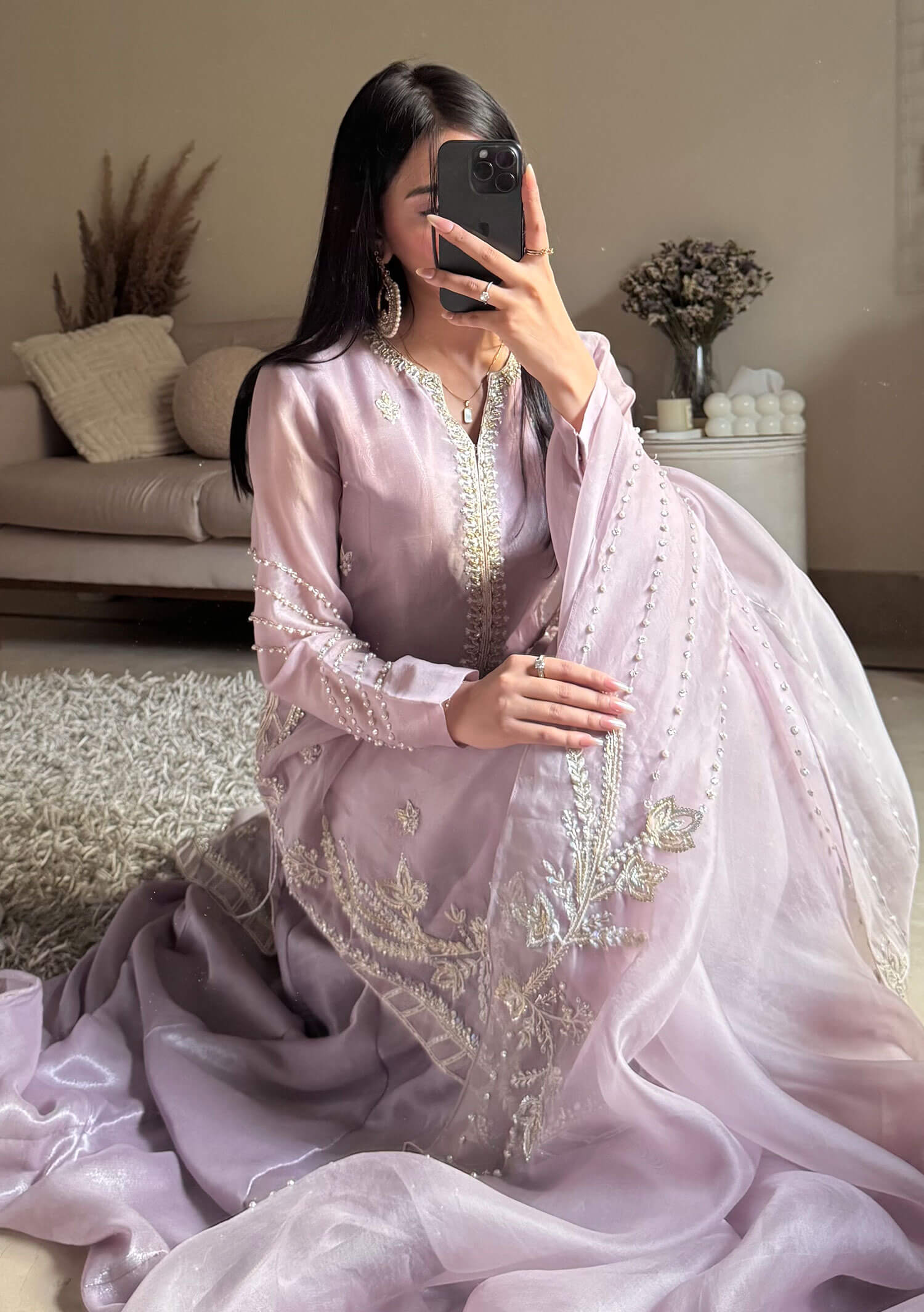 A vision of understated luxury in a universally flattering powder lavender hue. Crafted on premium soft organza, the outfit features exquisite handwork in ivory and light gold tones with delicate kundan accents. Paired with a flowing maysuri gown adorned with a ruffled hem and completed with a pure organza dupatta detailed with contemporary handworked borders, this ensemble exudes timeless sophistication.
