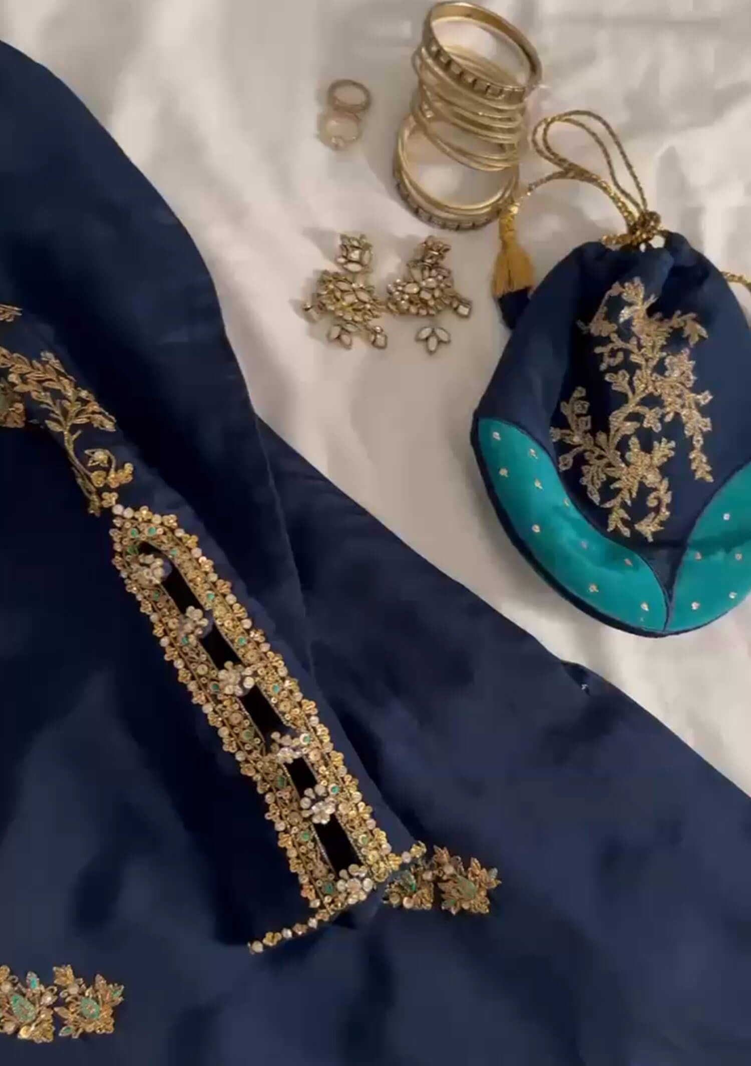 A timeless short shirt drenched in rich tilla and shimmering sequins, elevated with delicate ferozi resham knots for that perfect pop of colour. The button-detailed sleeves add a refined charm, while the easy, flared pants keep the look effortless yet luxe. Finished with a pure shisha organza block-printed dupatta, Zoha is your go-to for chic, traditional elegance. Pair it with our signature Potli to complete the moment.